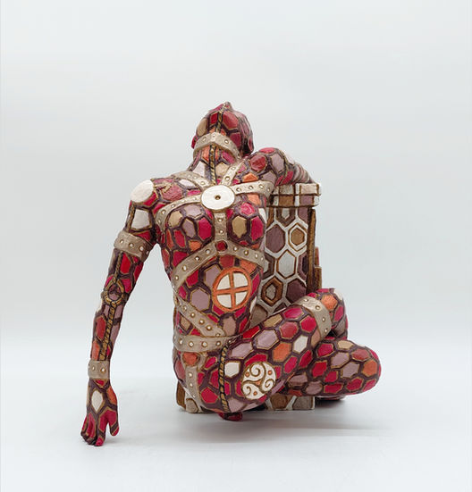This sculpture was created at a very difficult time in the artist's life, in which she was undergoing a creative block due to external reasons. The figure looks almost like a sacrificial victim; the capital personifies the art of Rabarama (the letters form her pseudonym) to which the woman tries to cling. Ropes and chains bind her, openly showing what are actually ethereal bonds, but which affect the mood and emotions of the Artist in a concrete way, blocking her. To enrich the meaning, various symbols are engraved along the entire surface: the hexagon predominates, a metaphor for the DNA and the cells that make us up and make us what we are; in the center of the chest, the symbol of the Sun, expression of strength, of life and receptacle of positive energies. A little further down, the symbol of the Earth: this holds the keys of clarity and profound intuition, in a word, the Earth is the symbol of life, all life, and representation of the Great Mother to whom we will return. The Triskell on the thigh It is an ancient symbol that mainly represents a Solar Wheel that symbolizes continuity; if turned to the left it is a very powerful talisman of White Magic against malice. In any case it is vital energy in its pure state, energy that manages to release, which allows us to act and work on multiple states of consciousness, on different levels that refer to the models that Mother Nature has made available to us. On the shoulder, also known as a symbol of "masculinity", the symbol of Mars embodies the Yang principle (like that of Venus represents that of Yin). This symbol is composed, it indicates both the rhythms of the cycles of life and death: on the one hand we have the driving forces of new beginnings, followed by the periods of reflective withdrawal and initiatory death for things that are no longer needed. On the back, the famous Yin and Yang: it constitutes the symbol of the duality existing in every element of which the Universe is composed, two opposite and complementary entities that form the whole. The work can therefore also take on a new meaning: it is a difficult moment, of stasis, but in which it is possible to gather the energies to be able to face the future that awaits us with strength.