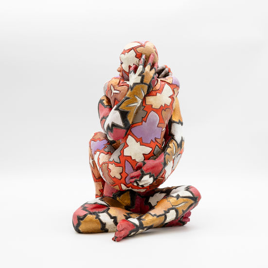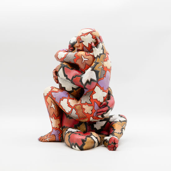 Eros, holds Psyche to himself, as in the tale of Apuleius Eros and Psyche. Both figures are engraved with stylized butterflies - the translation of Psyche in Italian is both butterfly and soul. The sweet embrace that tightens the two figures, albeit in an almost erotic position, wants to show the strength that lies behind the